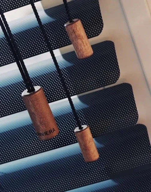 Den breda persiennen finns såklart också i aluminium. Funkar som den klassiska men med lite större reglage. Lamellerna går att få perforerade i vissa färger. På platser där ljuset får tillåtas att silas in genom de små hålen är det väldigt snyggt.