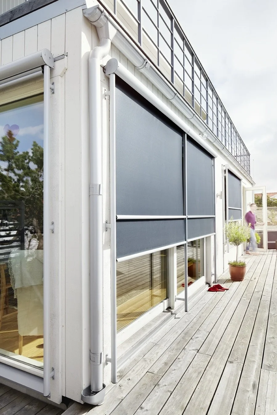 Som en rullgardin på utsidan med sidokanaler för hållfasthet när det blåser. De tekniska vävarna som oftast används skapar ett fantastiskt solskydd men lämnar också en möjlighet att se ut igenom väven. Det skapar en öppnare känsla när markisen är nere. Modellen som vi kallar för Zip är dessutom mycket vindtålig och passar i alla miljöer men även de mest väderutsatta.